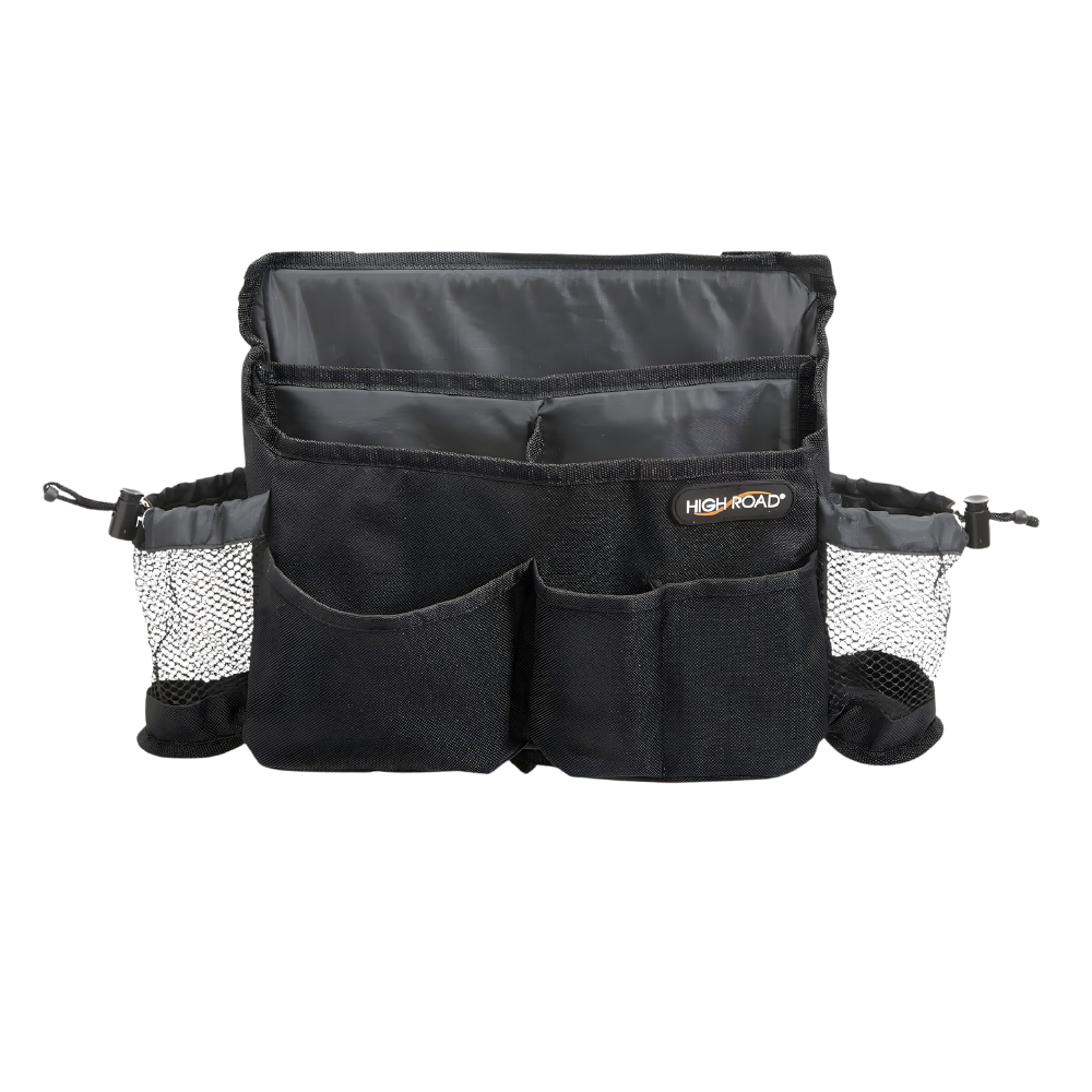 Designed for electric scooters, folding walkers, wheelchairs, and rollators, the High Road Mobility Organizer was the first storage bag created specifically for mobility aids. Originally developed in 2009 at the request of a veteran’s service organization, this organizer adapts our popular car seat organizer design to meet mobility users’ everyday needs.